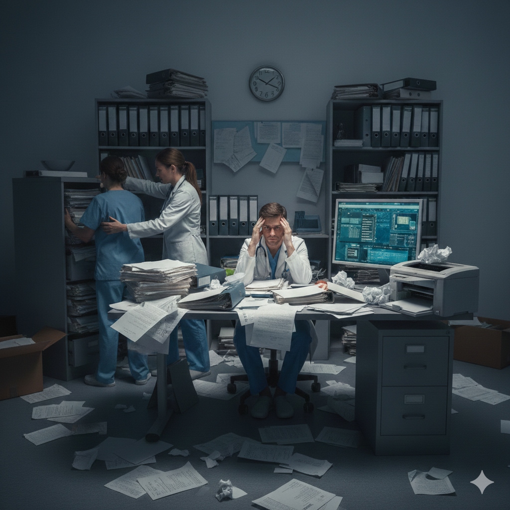 Una parte significativa de la jornada laboral médica —aproximadamente el 40%— se consume en tareas administrativas que no aportan valor directo a la atención del paciente. La dependencia de documentos físicos y sistemas desorganizados provoca la pérdida frecuente de papeles, retrasos en la localización de información crítica y duplicación innecesaria de registros. Las historias clínicas se encuentran fragmentadas en múltiples formatos y plataformas, lo que dificulta el acceso oportuno a datos completos y actualizados.